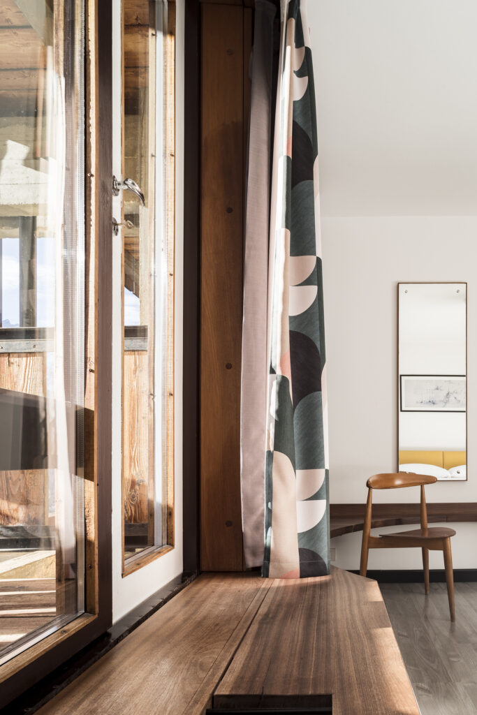 Step back in time and live the concept idea of arch. Gellner in our 60’s rooms with mountain view of the Dolomites – where vintage style meets modern comfort. Each of our 84 rooms has a comfortable double bed, a bathroom with shower, parquet floors, and its 60’s original furniture. All overlook the woody forest spruces and have a front-place view of Mt. Pelmo. Bold shapes and vibrant colors create a warm and inviting atmosphere – an ode to the modernist concept design of Gellner. Shades of different materials like mahogany wood and nude iron offer a timeless aesthetic.